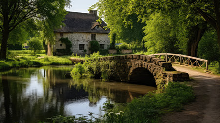 Scenic watermill beside a stream in a lush green landscape with morning sunlight.