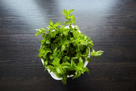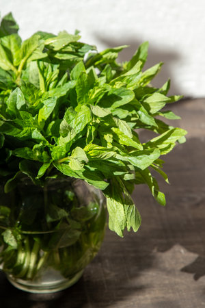 fresh mint close up on wood desk. tea leaves