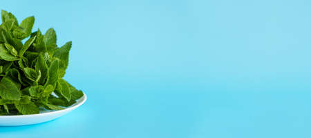 Cafes and restaurants, refreshing drinks, natural products, healthy food concept - laying out banner bundles of fresh green mint leaves on a white plate or saucer light blue background copy space.