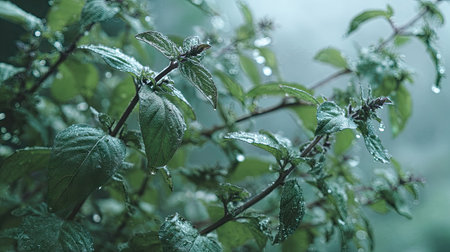 Peppermint in gentle light rain, soft raindrops visible on vivid green leaves, natural realistic style, bright fresh colors, balanced wide composition, cinematic framing, highly detailed.
