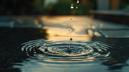 Water droplet splashing in a puddle creating ripples on a rainy day