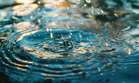 Close-up of raindrops creating ripples as they fall into water, with a bokeh effect. Ideal for nature and tranquility themes.