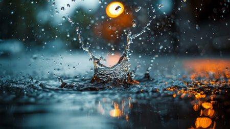 A splash of water is captured in a photo, with the water droplets falling from the sky. Concept of movement and energy, as the water droplets seem to be in motion