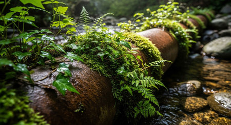 A massive pipe disrupts the natural landscape of a dense forest, standing prominently amidst the trees, Sunlight peeping through massive industrial pipelines in a forest, AI Generated