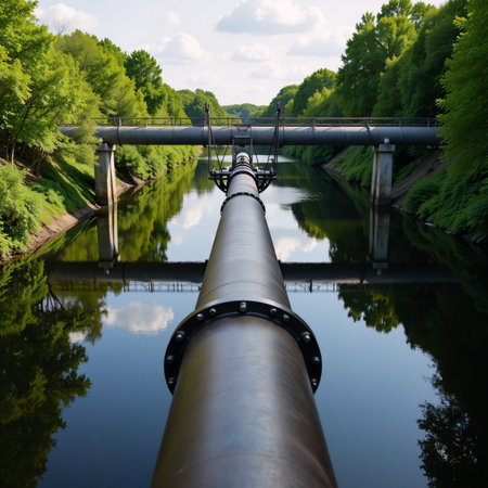 A large pipe is seen sitting in the middle of a river, disrupting the natural flow of water, Pipelines reflected on a crystal-clear lake surface, AI Generated