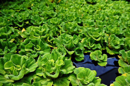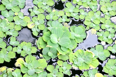 Top view of pistia or water lettuce floating on the surface of water in a pond.