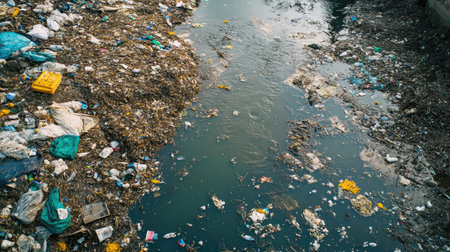 A polluted urban waterway filled with garbage and debris highlights the pressing environmental issues facing communities. The scene underscores the need for effective waste management solutions.