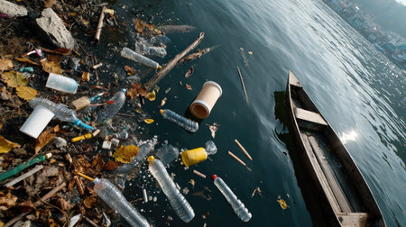 A striking image depicting a small boat surrounded by pollution in an urban waterway, illustrating the severe impact of waste on water ecosystems.