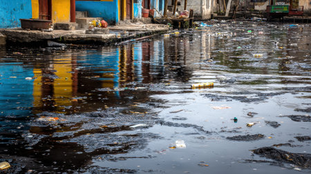 Polluted Urban Waterway with Colorful Buildings and Trash Floating, Reflecting Environmental Issues and Urban Decay in a Cityscape Setting