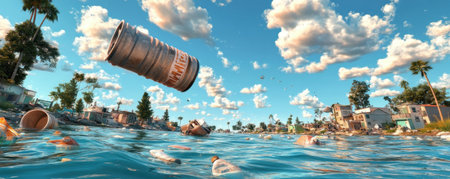 A vivid scene depicting plastic waste and debris floating in calm water near a shoreline. The image highlights environmental pollution and the impact on aquatic life, emphasizing the urgent need for waste management and conservation efforts.