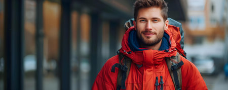 A stylish young man prepares for adventure with a backpack in hand. Concept Travel, Adventure, Style, Outdoors, Young Man