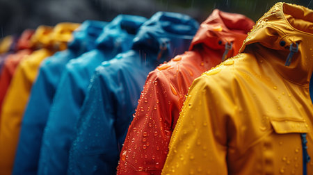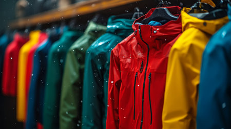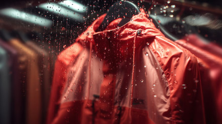 This striking image captures a wet rain jacket hanging in a store, enhanced by shimmering water droplets. Ideal for fashion and outdoor themes.