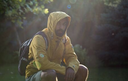 Young attractive man with beard sitting on rock in forest with raincoat and with hood on head