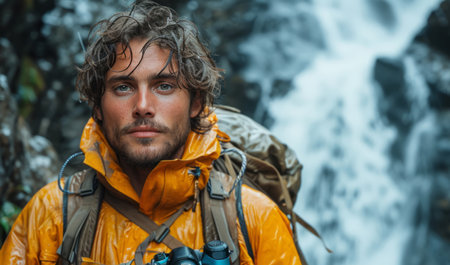 Waterfall, portrait and selfie with hiking gear for travel, freedom or vacation. Health, activity