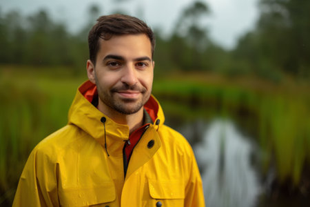 a happy portrait of a man wearing a raincoat. GENERATE AI