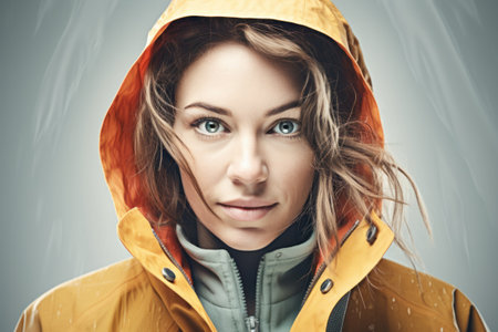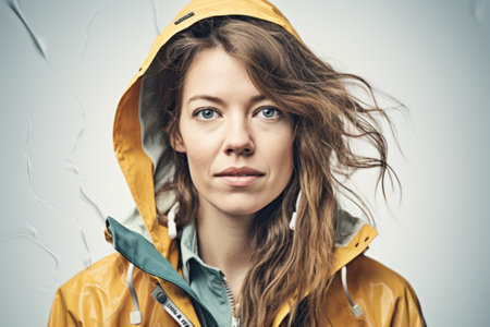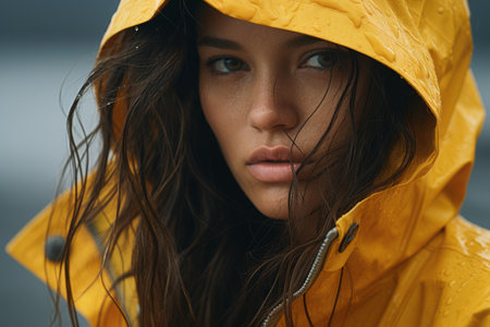 An AI generated illustration of a young female wearing a bright yellow raincoat outdoors in the rain