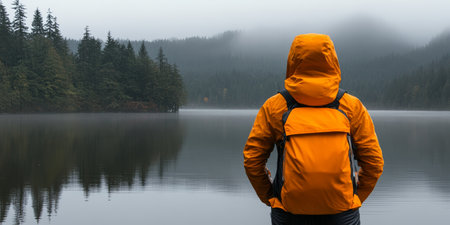 A Tranquil Scene of a Woman with a Backpack Gazing at a Serene Lake Surrounded by Misty Trees