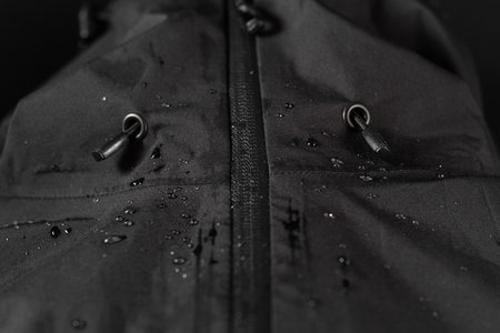 Waterproof fabric for outerwear. Water drops on the fabric. Outerwear accessories.