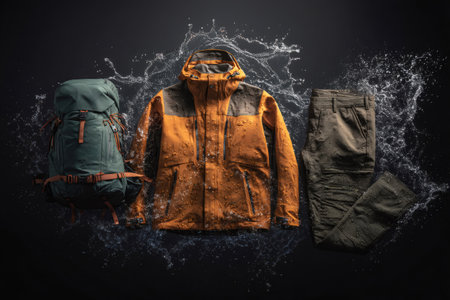 Waterproof jacket, pants, and backpack demonstrating water resistance amid splashes on a black background