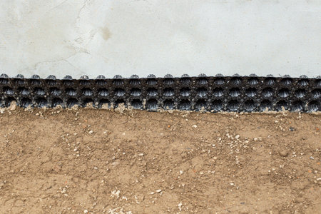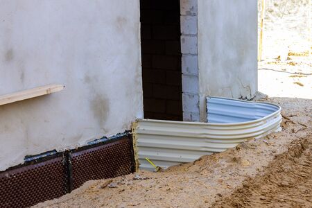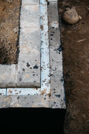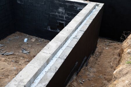 Damp proofing. House basement,foundation insulation details with waterproofing and Damp Proof membranes outdoors