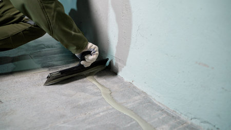 Human hand in protective glove applying waterproofing sealant to floor and wall corner, ensuring durable home renovation