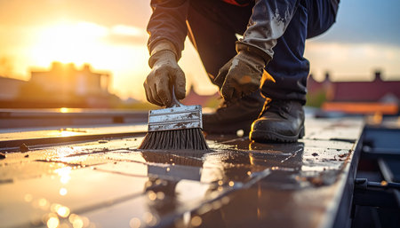A construction worker in gloves applies sealant to a rooftop with a brush during a vibrant sunset, highlighting the work.