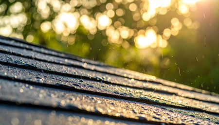 Detailed view of wet roof shingles catching golden sunlight, with falling rain and soft bokeh of trees.