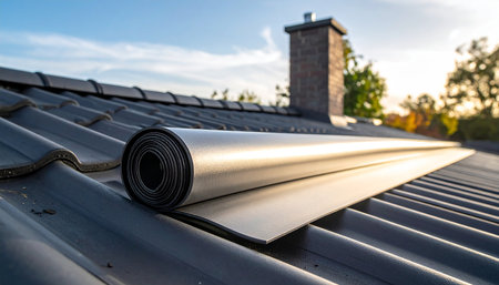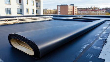 Roll of EPDM material being applied on a modern roof construction, highlighting durable, weatherproof roofing technology in progress.