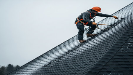 A professional roofer in a safety vest working on a dark asphalt shingle roof under a clear blue sky. Focus on the textured roof shingles.