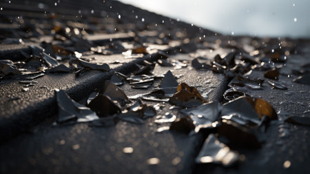 Close up of broken glass on the roof of a building in the rain