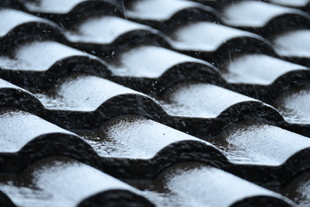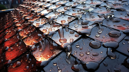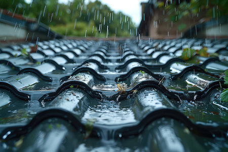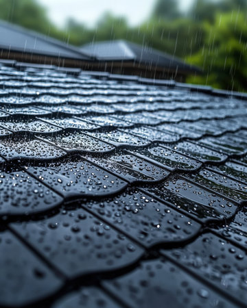 Textured roof tiles glisten with water droplets amidst a heavy rain, capturing a moody, atmospheric mood perfect for weather or roofing themes.