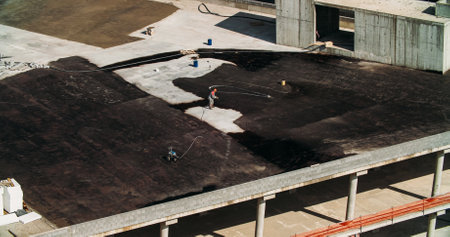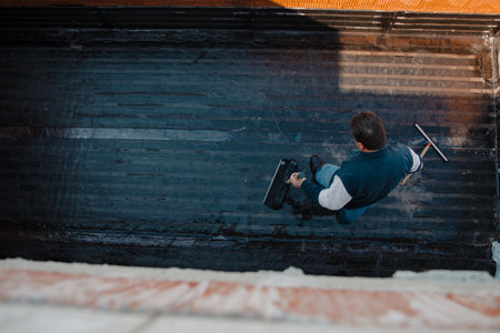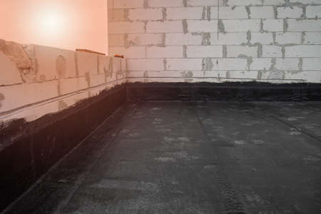 Waterproofing flat roof terrace with bitumen. Roof waterproofing. Bitumen insulating layer. Covering roofing material.