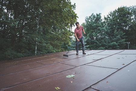 Roofer cleaning roof tiles with hose nozzle outdoors.