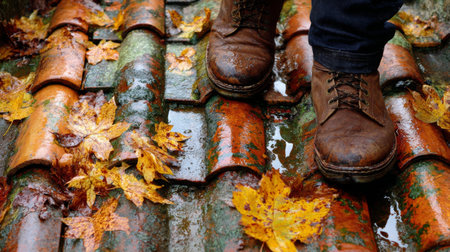 Brown boots step carefully on wet, leaf-covered tiles during a rainy autumn day