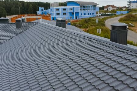 Modern roof made of metal. Corrugated metal roof and metal roofing.