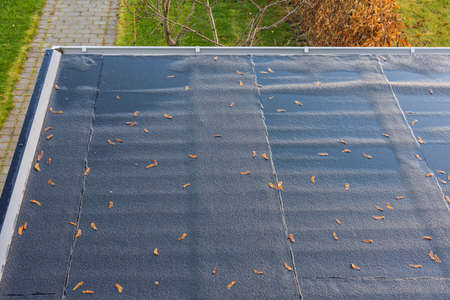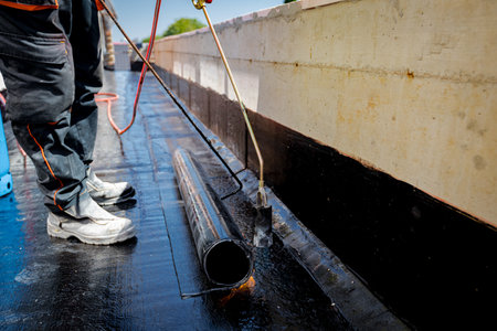 Waterproofing flat roof terrace with bitumen roofing material.