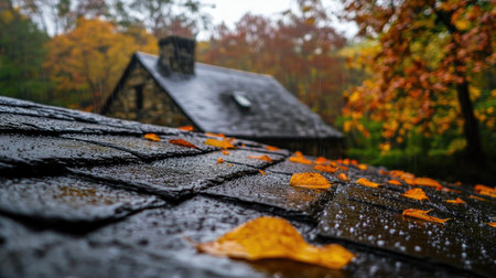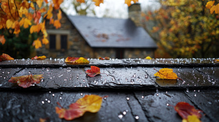 Captivating scene of autumn leaves resting on a slate roof, with raindrops glistening in the foreground and a cozy house nestled among vibrant fall foliage.