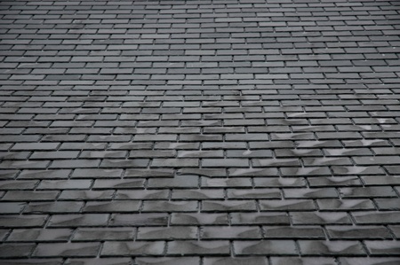 On a large building in the city on a rainy day is this sloping roofing roof with a roofing gutter
