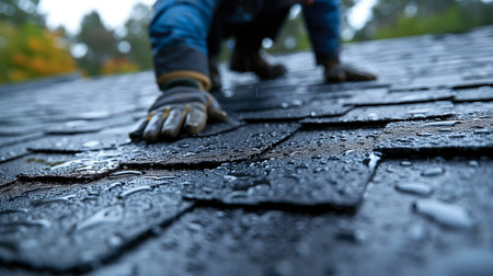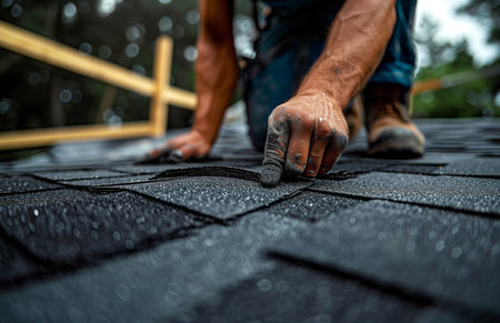 Detailed close up of a professional worker hands installing shingles on a roof, showing their repair and construction skills.