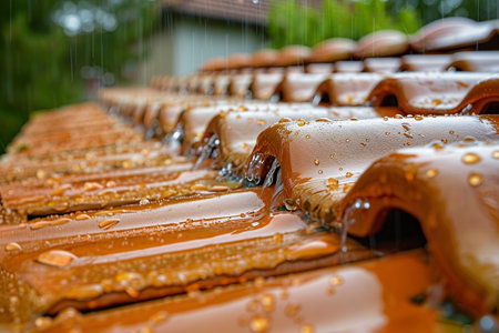 A close-up view of rainwater cascading over a terracotta tiled roof, capturing the intricate details of the wet tiles and the flowing water.