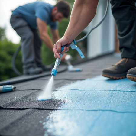 A construction worker applies waterproof coating on a roof surface using a roller. The scene captures the details of craftsmanship and the essential tools in use.