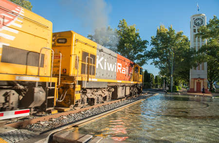 Hastings, New Zealand - March 30 2017: The Kiwi Rail run passed the clock tower in Hastings CBD in Hawke's bay region, New Zealand.