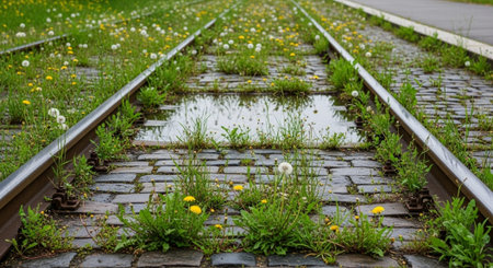 Seldom used, weathered railway line that is gradually overgrown by plants.