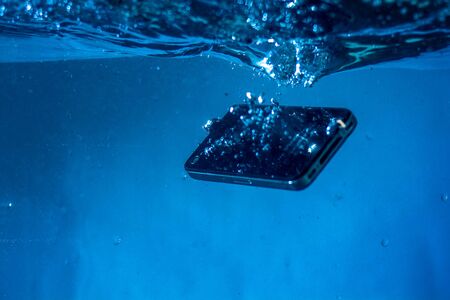 black and white phone dropped into the water. phone in water. blue water. phone in water bubbles.phone sinks in water