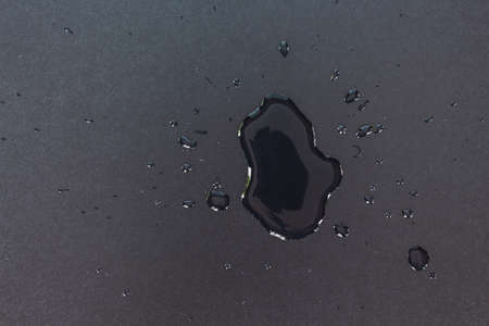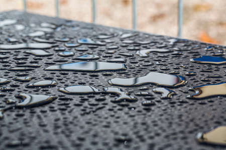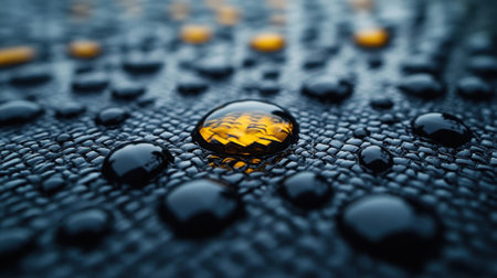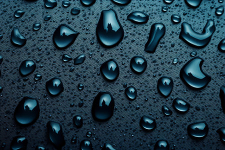 This image showcases a close-up view of water droplets resting on a dark, textured surface. The droplets vary in size, creating a pattern with highlights and shadows. The composition suggests an outdoor environment, possibly during or after rainfall. Suitable for illustrating concepts related to moisture, texture, and abstract design applications.
