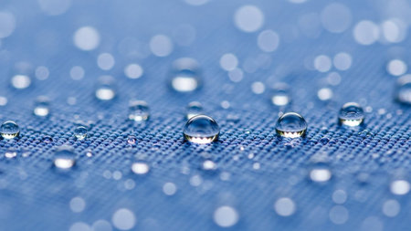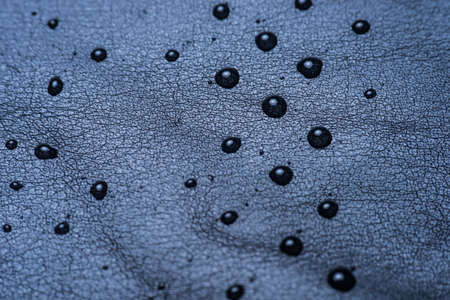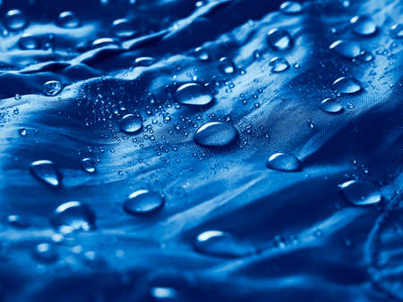 Water drops on waterproof membrane fabric. Detail view of texture of blue waterproof cloth.