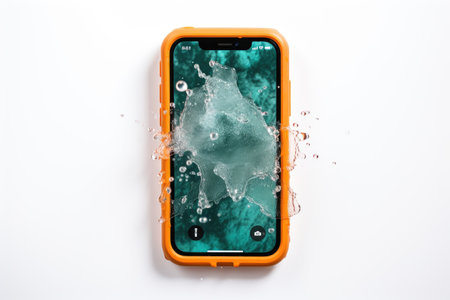 A smartphone stands on a wet surface, enduring a splash of water, highlighting its waterproof feature in a dynamic scene.