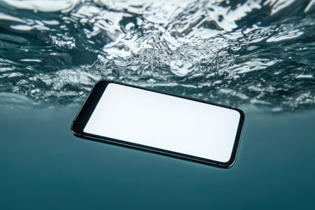 Modern smartphone floating or sinking in water with blank screen, perfect for showcasing waterproof tech or app design.