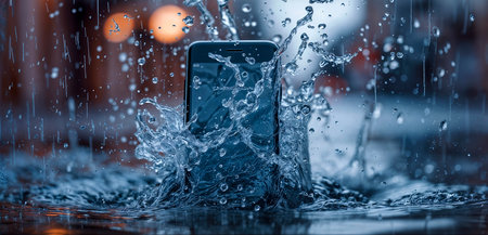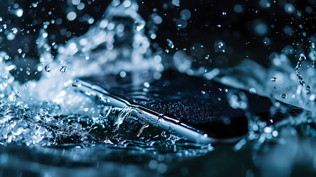 A captivating image showcasing a smartphone impacted by water, creating splashes and ripples on a wet surface. The clear reflections and dynamic motion highlight the blend of technology and nature.