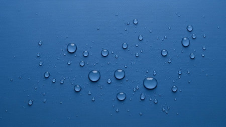 A clean, textured blue surface is adorned with a scattering of clear water droplets of varying sizes. The droplets are perfectly spherical, reflecting light and casting subtle shadows, adding a sense of depth and realism to the blue background has a subtle texture, providing a gentle contrast to the smooth, transparent water. evokes a feeling of freshness, purity, and hydration, making it a wide range of applications.
